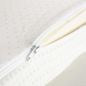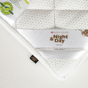 Betrækket er fremstillet i lækker og blød jacquard af polyester med indvævede sølvtråde, som virker antibakterielt og er modstandsdygtigt overfor støvmider. Derudover har betrækket også fået en naturlig Greenfirst antimidebehandling, der virker afvisende overfor husstøvmider. For optimal hygiejne er betrækket aftageligt og vaskbart ved 40 grader. Der er anti-slip i bunden, der sikrer, at topmadrassen bliver på sin plads. Vi anbefaler at anvende en rullemadras til at beskytte og forlænge levetiden af topmadrassen.
