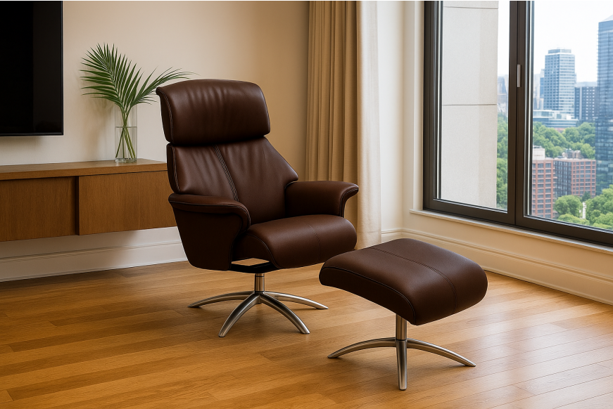 Info: Calibra høj lænestol med justerbar nakkeregulering og tilhørende fodskammel.